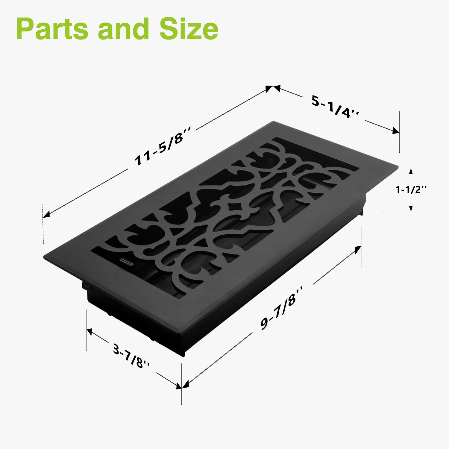 - Duct opening size: 4" X 10" (3-7/8" X 9-7/8"). Overall size: 5-1/4" X 11-5/8".