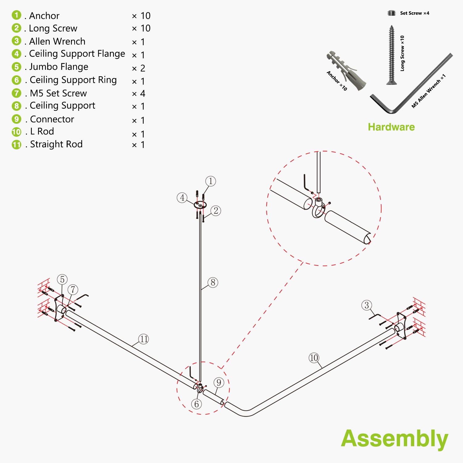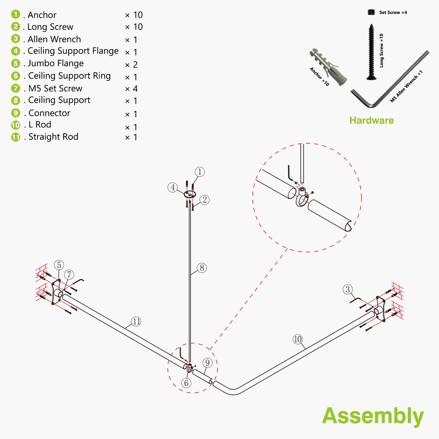 - Includes one 36" ceiling support which may be cut to needed length.
